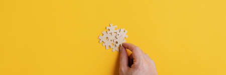 Wide view image of male hand choosing a puzzle piece from a pile of them in a conceptual image of business start up and project idea. Over yellow background with copy space.