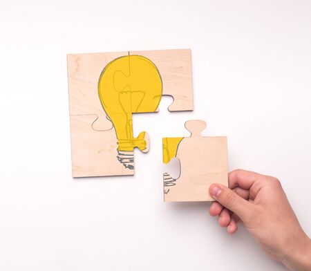 Finding Solution And Idea Creation Concept. Hand solving puzzle with drawn light bulb on white background