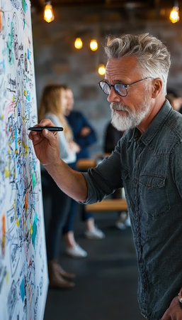 Male professional with glasses presenting innovative ideas on a concept-filled whiteboard.