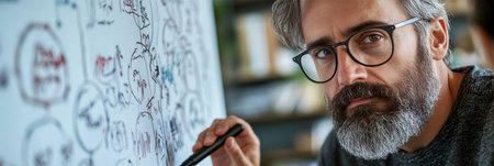 A Thoughtful Bearded Man Explains Ideas and Concepts on a Whiteboard During a Creative Meeting