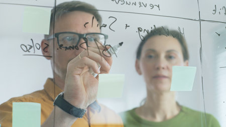 Business professionals brainstorming near glass board, using sticky notes for strategic planning, writing calculations, sharing innovative ideas during collaborative work session