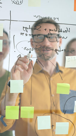 Professional team brainstorming strategic goals, mapping innovative concepts on transparent whiteboard with colorful sticky notes and black marker in modern workspace