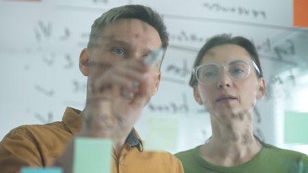 Couple of businesspeople discussing and brainstorming about solving marketing problem in front of glass board at business meeting by using mind map and sticky notes. Working together. Immaculate.