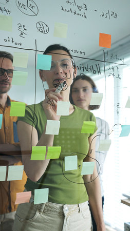 Business colleagues collaborating, using sticky notes on glass board, brainstorming innovative project strategy with focused teamwork and dynamic communication. Business people concept