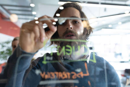 Caucasian businessman working in creative office. man taking notes on glass board. business people and work colleagues at a busy creative office.