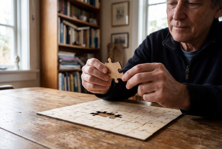 Elderly caucasian male assembling wooden jigsaw puzzle in cozy home library