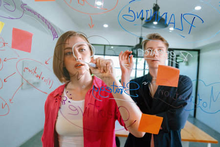 Couple of young creative start up business people brainstorming idea and solving problems by using sticky note and mind map at glass board, meeting room. discussing, working together.