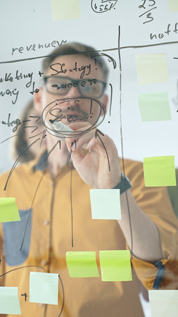 Business people are brainstorming and writing ideas on a glass wall with a marker, discussing revenue, marketing, partners, sales and bonus during a productive office meeting