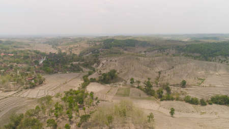 agricultural land in rural areas with farmlands, fields with crops, trees in arid hilly terrain. aerial view growing crops in asia in hilly areas Indonesia.