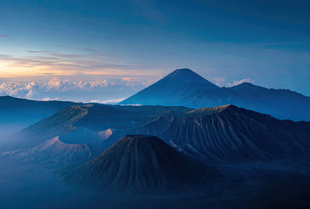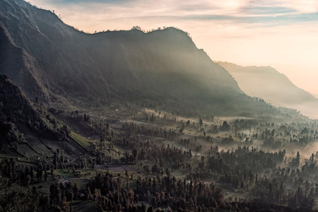 Mountain area in the early morning, while the valley covered by thick mist. Location : Bromo, East Java, Indonesia