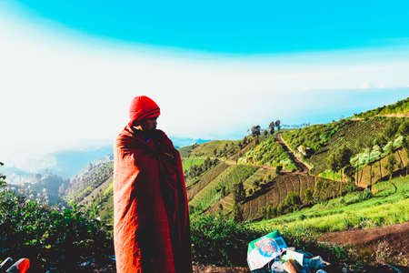 Rural landscape of sunrise with mountains. The sky look dramatic with reddish orange in cloudy weather. Seen Village, rice field and dense of trees covered by mist. Indonesia