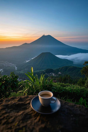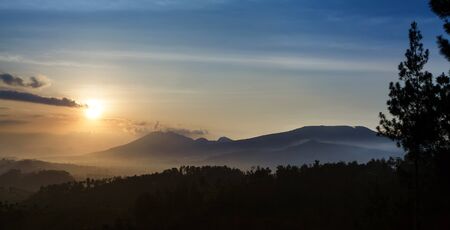 Sunrise Mountains.Asia Nature Morning Volcano Viewpoint.Mountain Trekking,Wild View Landscape.Nobody photo.Horizontal picture.First Rays Rising Sun.White Fog Background.Highly Detailed Image