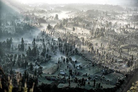 Sunrise View At A Volcano Crater Village With Mist and Sunray Mount Bromo, Indonesia