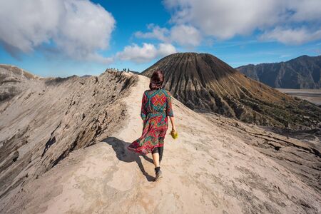 Young Asian woman walking on narrow crater ridge of Bromo volcano mountain, East Java island in Indonesia, Asia