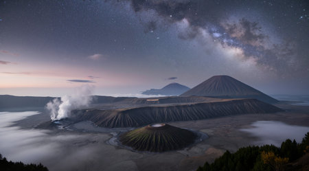 Landscape view of misty mount Bromo volcano. Foggy morning in the java national park with mount Semeru