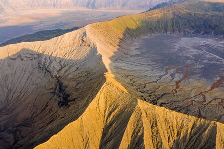 Crater with active volcano smoke in East Jawa, Indonesia. Aerial view of volcano crater Mount Gunung Bromo is an active volcano
