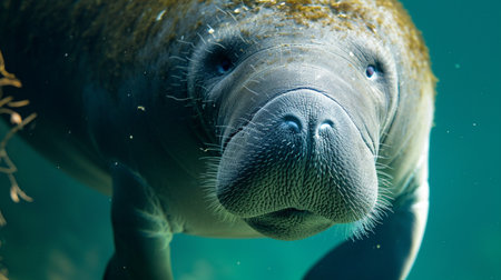 A close-up of a manatee's face underwater. The manatee has a textured, gray skin, a large, rounded snout, and small eyes. The manatee appears to be looking directly at the viewer.
