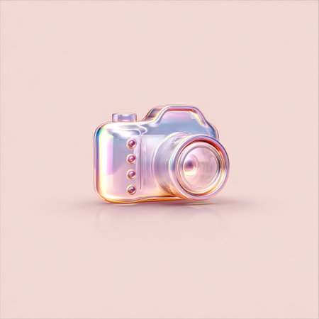 A shiny, iridescent camera is the central subject of the composition, rendered in a futuristic, digital style. The object is illuminated on a pale pink backdrop. This illustration can be used for various purposes, including digital marketing, web design elements, or editorial content.