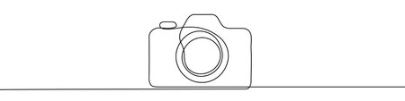 Camera in one line art style. Camera drawing with editable black stroke on a white background. Vector illustration.