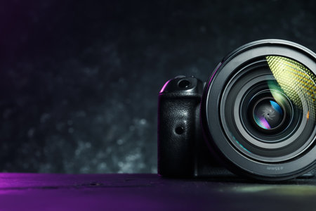 Photographer workplace with dslr camera system on dark black table background. Hobby travel photography concept. Flat lay top view copy space