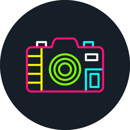 A stunning illustration of a neon camera that combines vibrant colors with a glowing outline, symbolizing the fusion of photography and technology in modern art.