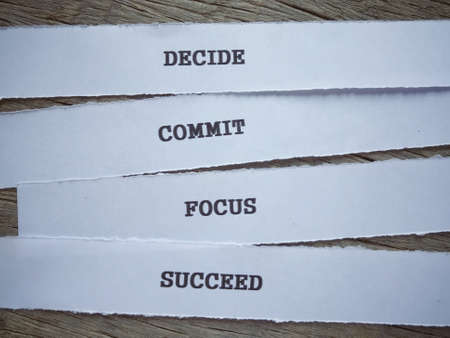 Motivational and inspirational words - Decide, Commit, Focus,Succeed written on papers and placed on a wooden table.