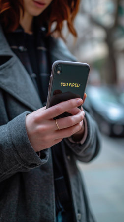 A woman holding a cell phone with the word fired on it, AI