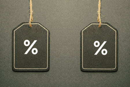 Discount tags in vibrant yellow scattered across a surface highlight various percentage signs, creating a lively scene of retail promotions and savings.