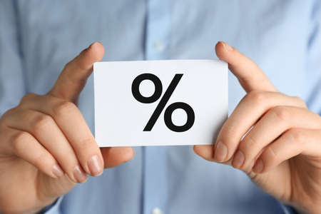 A human hand holds a blue percent symbol against a blue backdrop, illustrating concepts of finance, business, and savings during a daytime setting.