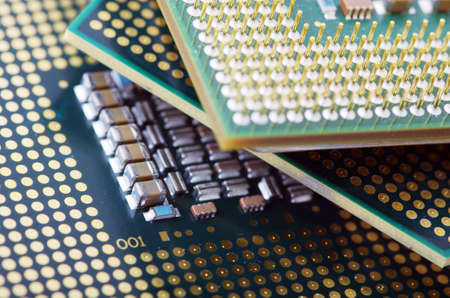 Close up of CPU Processor over Computer Motherboard. Tecnology background.