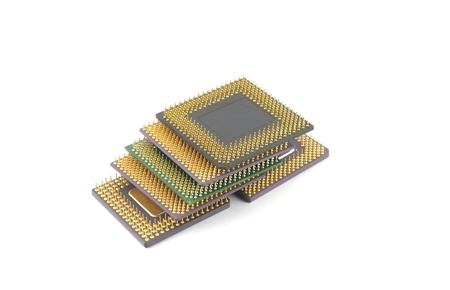 cpu or Microchip Computer set with gold stroy on the background of silver chips