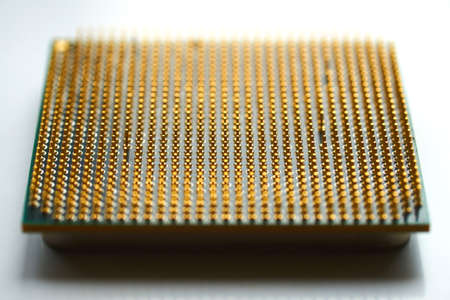 Closeup of CPU pins, gold connectors for central processing unit on personal computer. Computing technology
