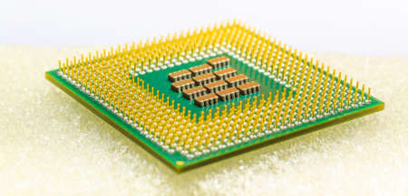 Computer processor, contact feet. Electronic board with electrical components. Electronics of computer equipment.