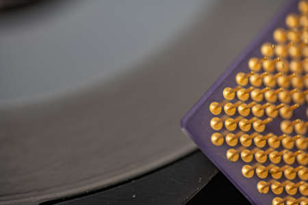 Processor to the computer. Concept for technology and computing. Detail of connectors. CPU Chip Processor for tech science background.