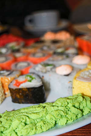 close up wasabi in small bowl with sushi