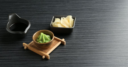 Hot wasabi paste, soy sauce and ginger on black textured table. Space for text