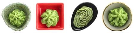 Green wasabi in bowls isolated on white, set