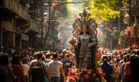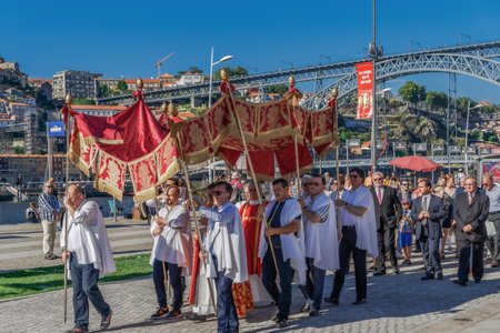 Porto, Portugal Catholic Christian religious holiday procession. Flower decorated statues carried by people on the bank of Douro river at Vila Nova de Gaia, with Luis I Bridge visible.