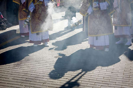 Holy Week procession with Nazarenes carrying smoldering incense, Holy Week concept.