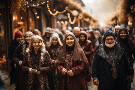 Diverse crowd holding candles in a traditional procession across city street at dusk. concept of community, cultural heritage, spirituality.