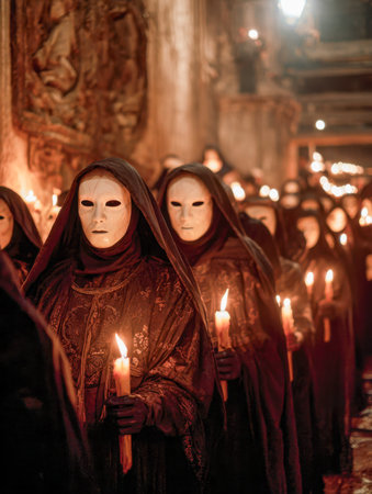 Shadowy figures in ghostly white masks and somber cloaks move silently through a candlelit chamber, surrounded by ornate carvings and ancient stone architecture.