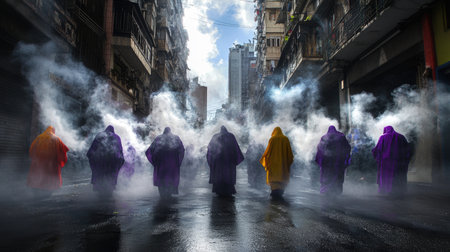 A captivating scene of mysterious figures in colorful cloaks walking through a foggy urban street, creating an atmospheric and surreal moment in the city.