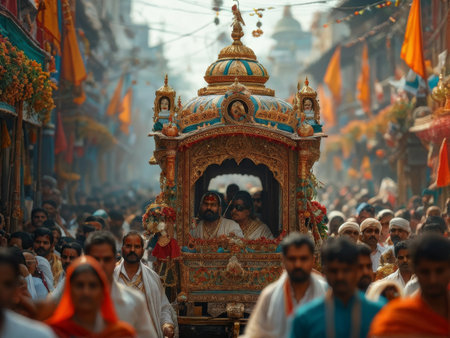 Ratha-yatra festival of Lord Jagannatha, Balabhadra and Subhadra during the annual Rathayatra in Odisha in the background. Happy Hindu India