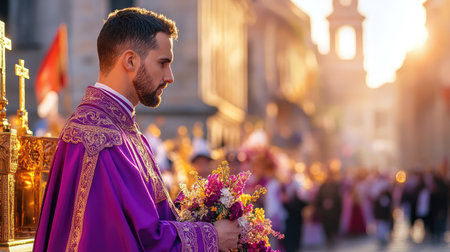 A solitary man dressed in a purple robe holds a bouquet of flowers during a vibrant religious procession in a historic city street at sunset.