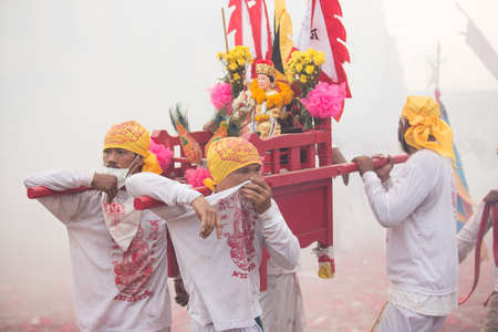 SURAT THANI, THAILAND - APRIL 3 , 2015 : Surat Thani Vegetarian Festival on April 3, 2015 in Surat Thani, Thailand. During the festival ritual mortification is practised to appease the Gods.
