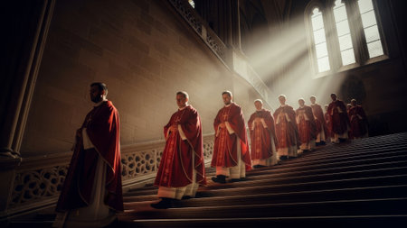 Men in red robes walk up cathedral stairs. Sunbeams, Gothic architecture.