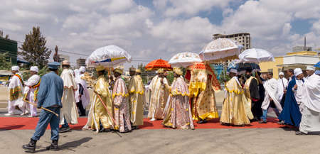 Addis Ababa - Jan 19: A priest wearing a colorful traditional gown holding a large cross has his picture taken by another priels, during a Timket celebrations of Epiphany, on January 19, 2017 in Addis Ababa, Ethiopia.