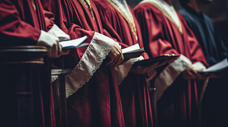 A panel of judges in traditional robes stands in a courtroom during a constitutional court session. This solemn gathering represents the integrity and authority of the judicial system.