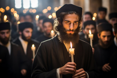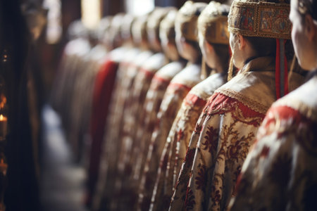Religious leader presides over congregation during somber ceremony. Concept Religious Ceremony, Somber Atmosphere, Spiritual Leader, Congregation, Religious Rituals