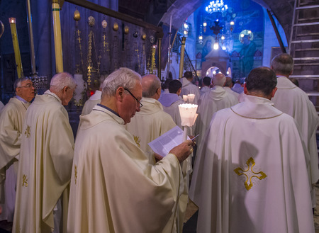 JERUSALEM - APRIL 13 : A procession of monks holding candels during Easter in the church of the holy sepulcher in Jerusalem Israel on April 13 2017